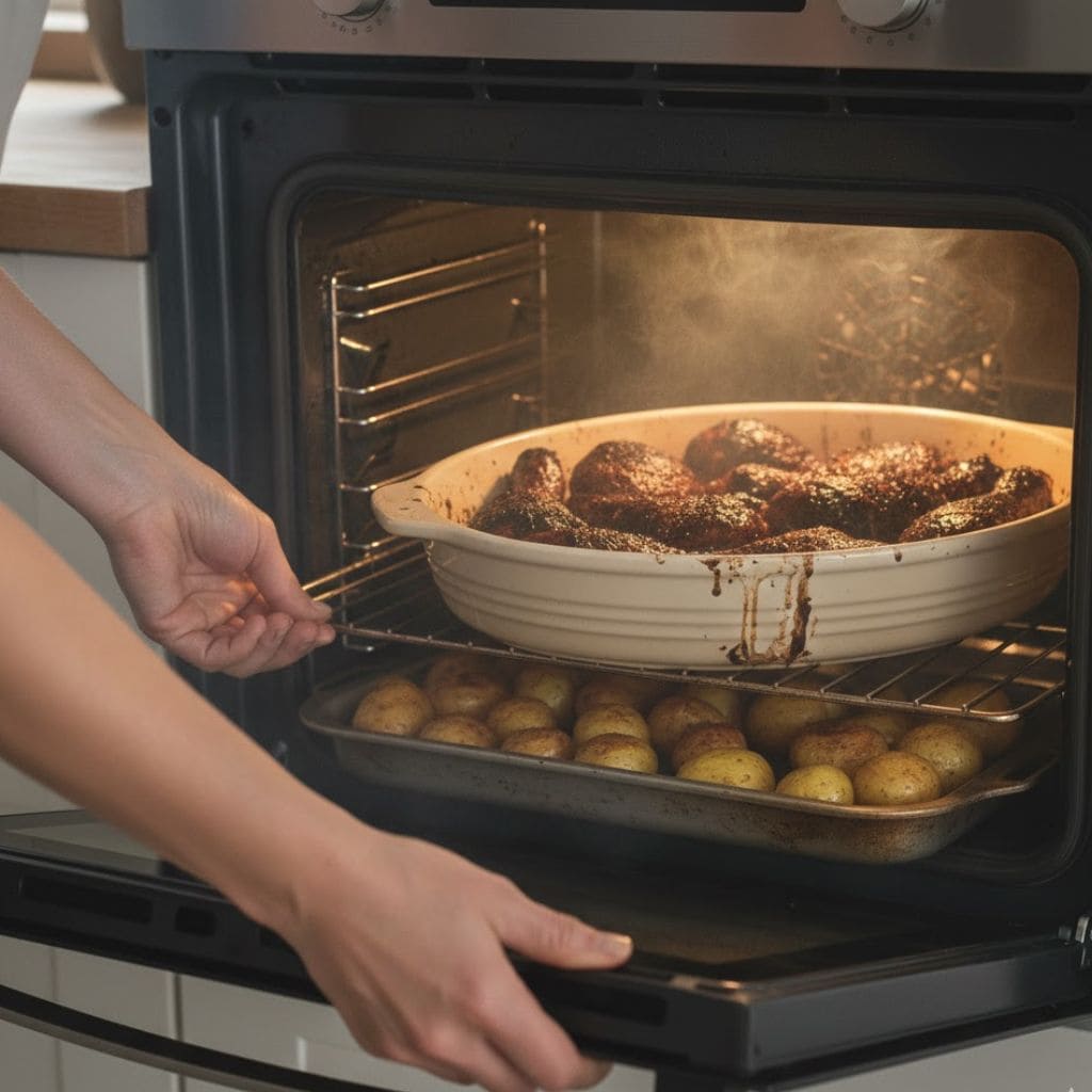 The chicken had gone beyond golden brown into something darker. The edges were charred, and the lemon marinade had caramelized too aggressively against the ceramic dish.