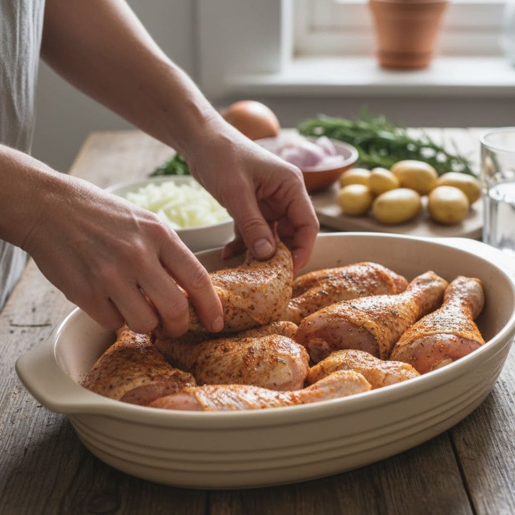 I arranged the chicken in a ceramic baking dish and placed it in the oven at 400 degrees Fahrenheit, setting the timer for thirty-five minutes.